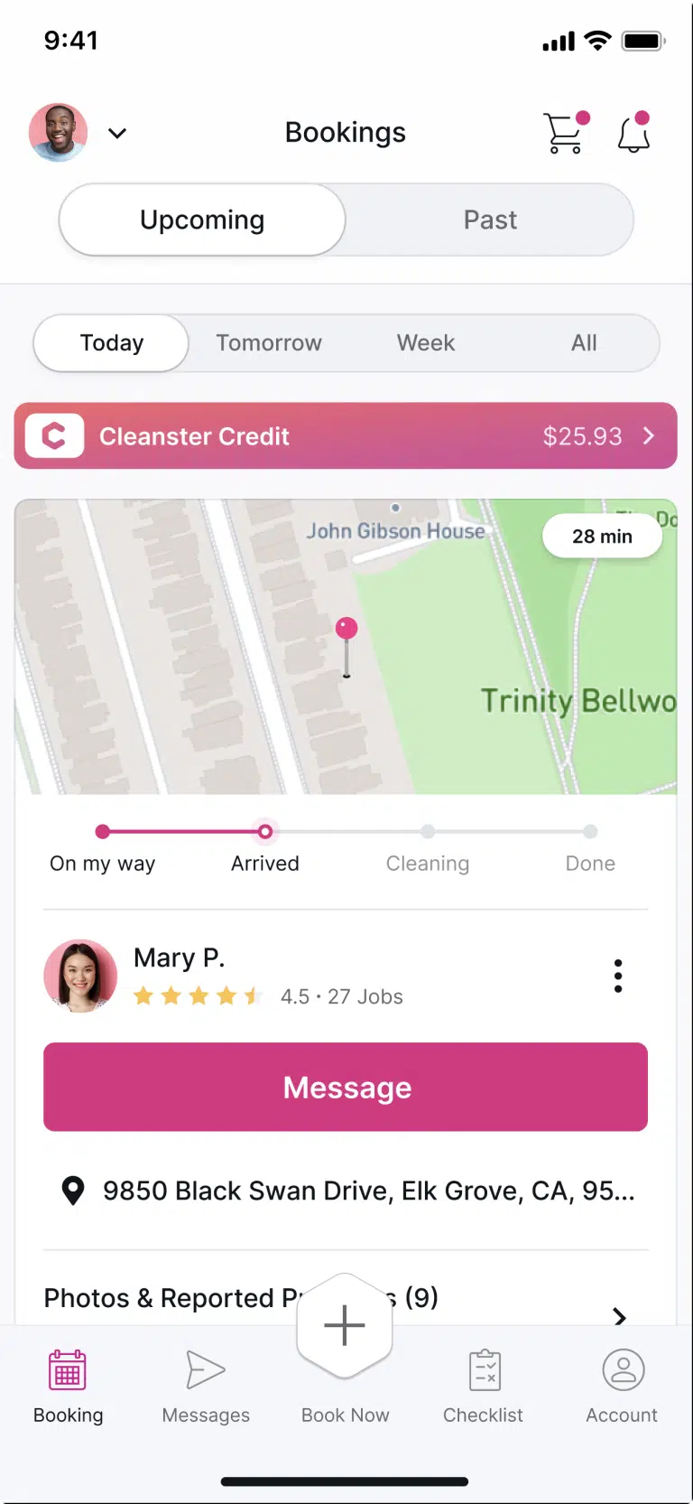 Nossos profissionais de serviço são especialistas locais, com histórico completo e seguro de Responsabilidade Civil Geral de pelo menos $2 milhões. Através do nosso aplicativo intuitivo, seu profissional de limpeza notificará você quando estiver a caminho, iniciando e concluindo o serviço, com anotações e fotos opcionais.